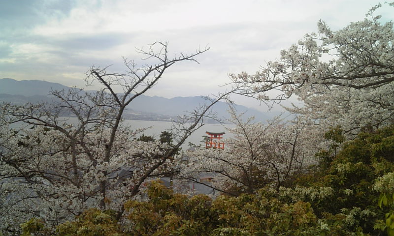 桜越しの鳥居&瀬戸内海に浮かぶ本土